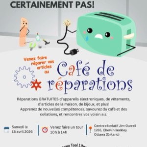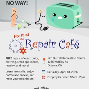 The Ottawa Tool Library, in collaboration with the City of Ottawa is hosting a Repair Café on Saturday, April 18th, from 10 a.m. to 2 p.m. in Ellwood Hall! at the Jim Durrell Recreation Centre (1265 Walkley Road).